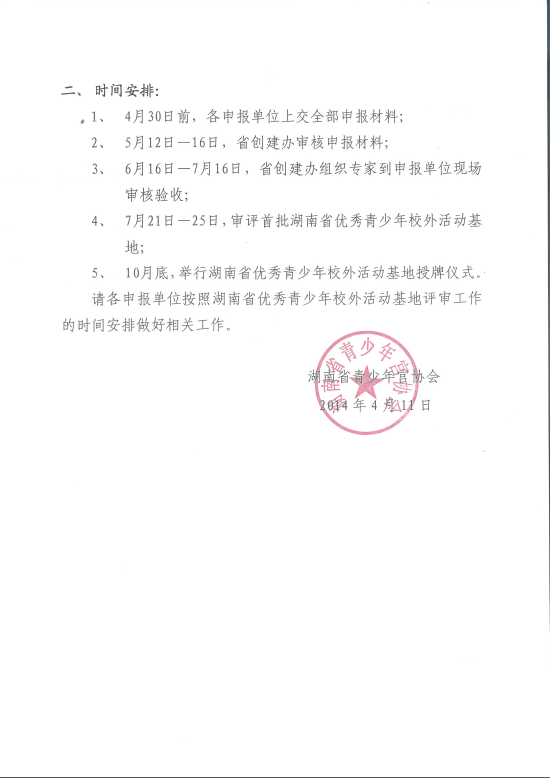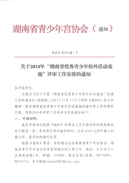 关于2014年“湖南省优秀青少年校外活动基地”评审工作安排的通知
